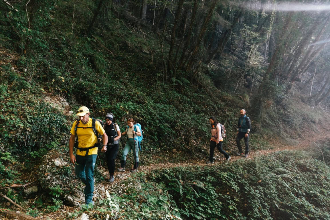 Scendiamo attraverso il fitto bosco, seguendo la buona traccia fino a raggiungere un incrocio e un rudere poco visibile. Proseguendo, ci avviciniamo alla fonte e, uscendo dal bosco, raggiungiamo un panoramico pendio. Qui lasciamo il sentiero principale per risalire verso il Monte Piglione Nord.