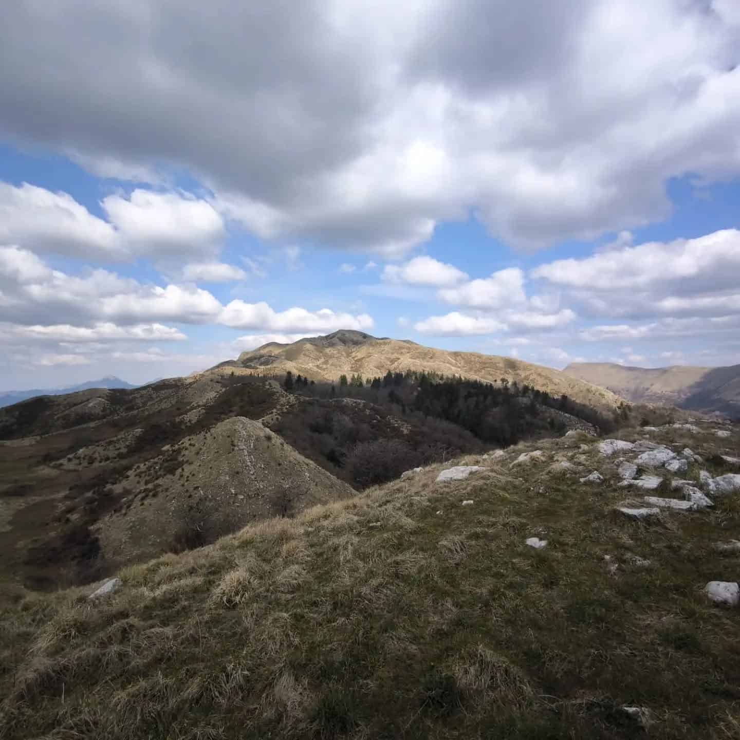 Dal monte, scendiamo sull'ampio crinale occidentale, mantenendo il crinale principale verso nord/ovest. Proseguiamo fino alla cima, dove ci fermiamo ad ammirare il panorama. Dopo aver raggiunto il Monte Prano, scendiamo per la cresta sud/orientale, seguendo una buona traccia.