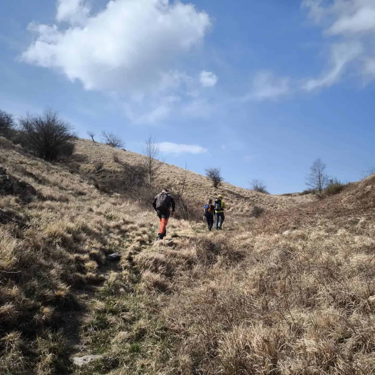 Superiamo un grande cancello di metallo e ci innestiamo su una sterrata, mantenendo la sinistra. La sterrata termina presso una casetta di sasso abbandonata, dove troviamo una traccia in falsopiano che, dopo circa cinque minuti, esce dal bosco. Risaliamo un pendio a destra, seguendo vecchi segni rossi, che ci conduce al Monte Pedone.