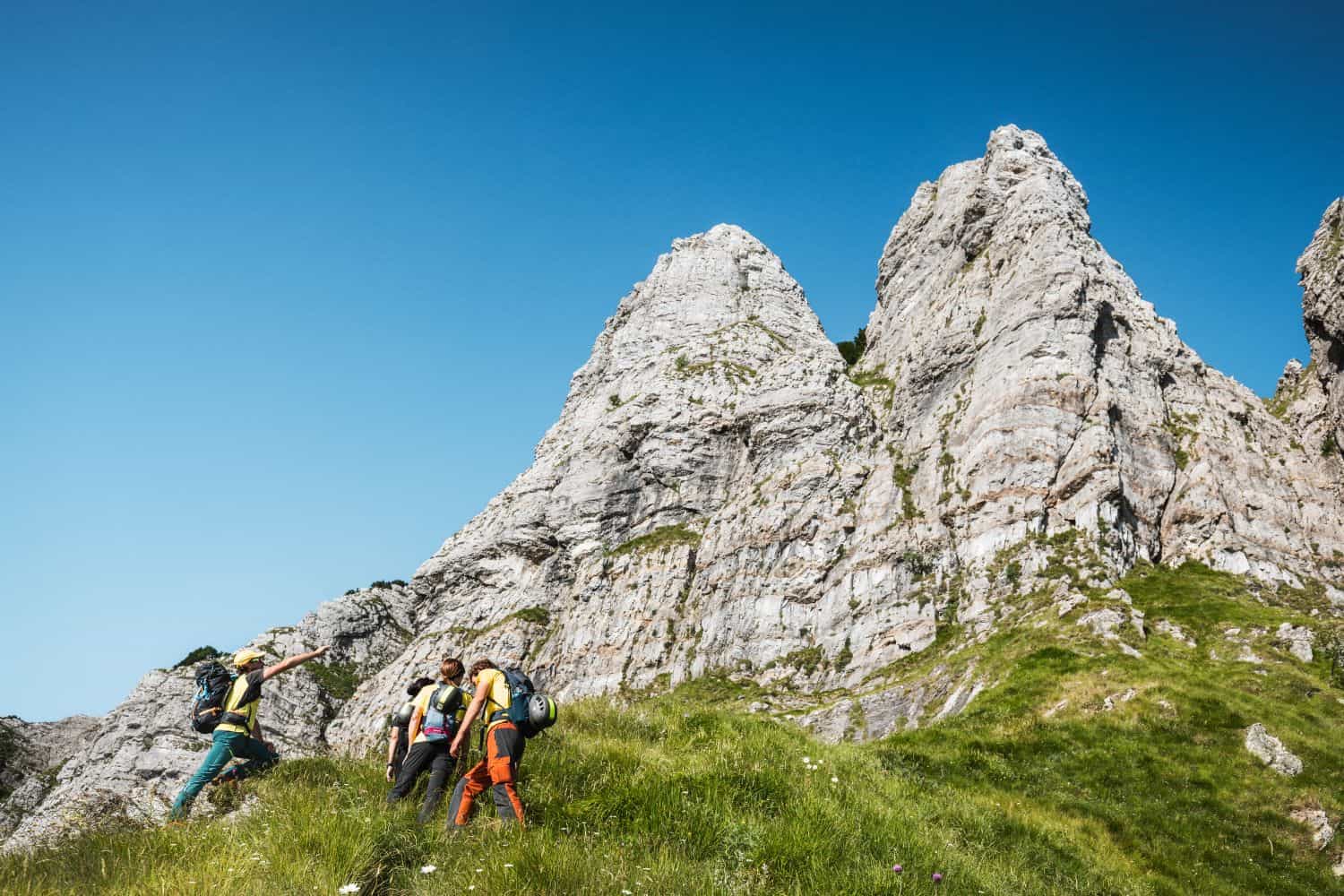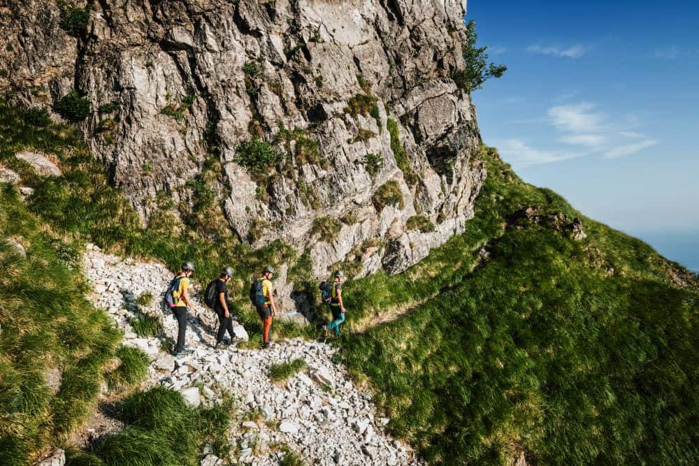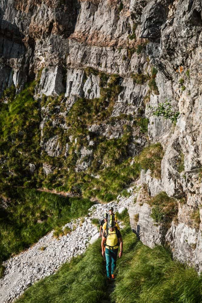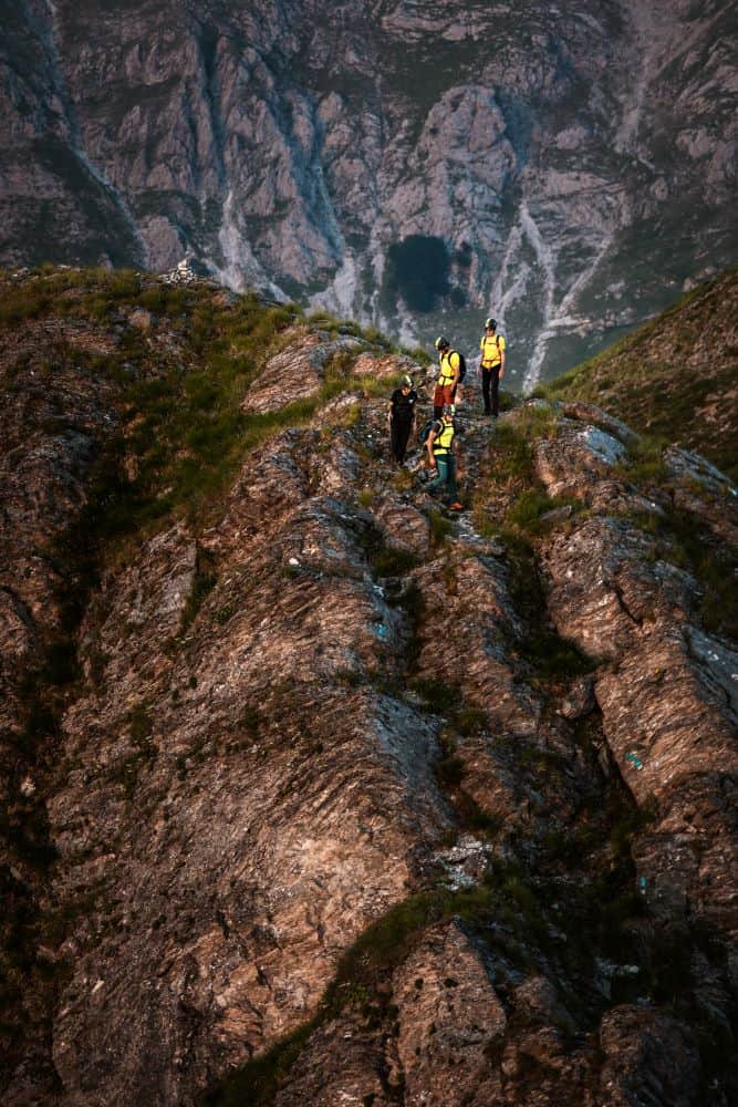 Dopo una pausa in vetta, inizieremo la discesa lungo la via normale sul versante nord, passando davanti ai resti del vecchio bivacco Lusa Lanzoni (1640 m).